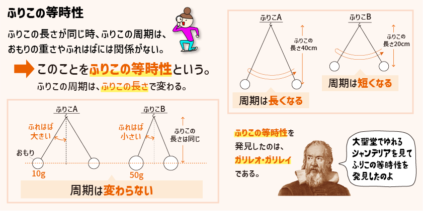 このふりこの性質を「ふりこの等時性」といい、ガリレオ・ガリレイが発見しました。
