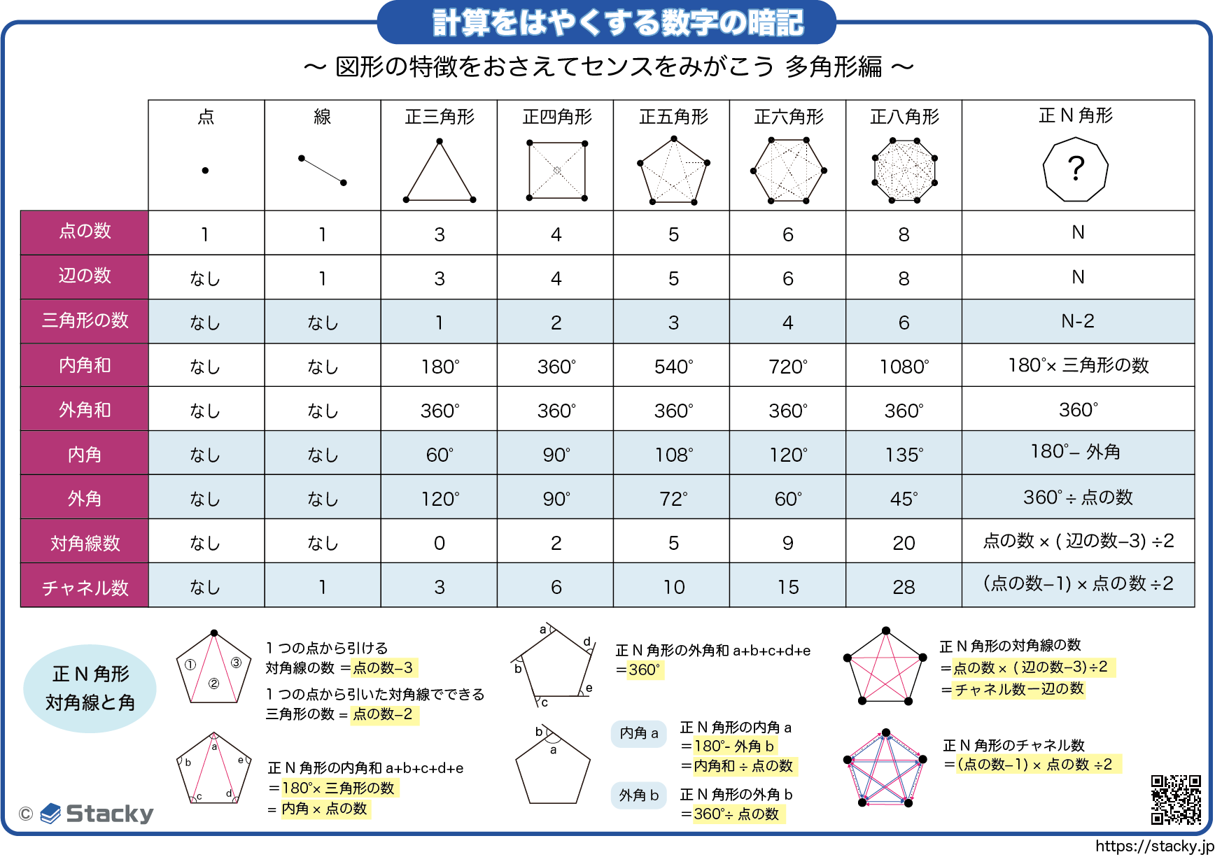 つまり、外角=360°÷点の数、内角=180°-外角、内角和=内角×点の数、ともいえます。
