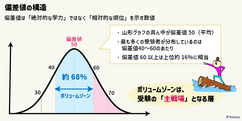 よく聞く「ボリュームゾーン」とは、最も多くの受験生が集中している偏差値帯のことです。