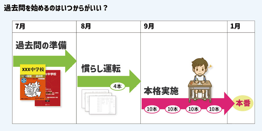 塾や家庭学習の進度にもよりますが、「9月」から過去問に着手するのがおススメです。