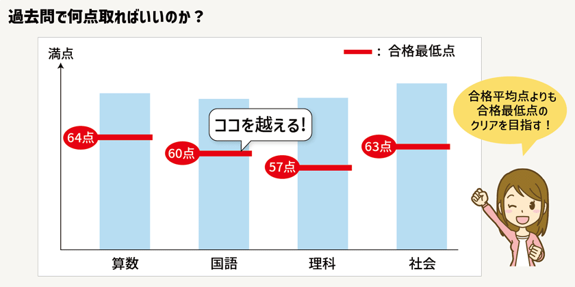 しかし、過去問には「合格者平均点(教科別)」と「合格者最低点(総合)」しかありません。