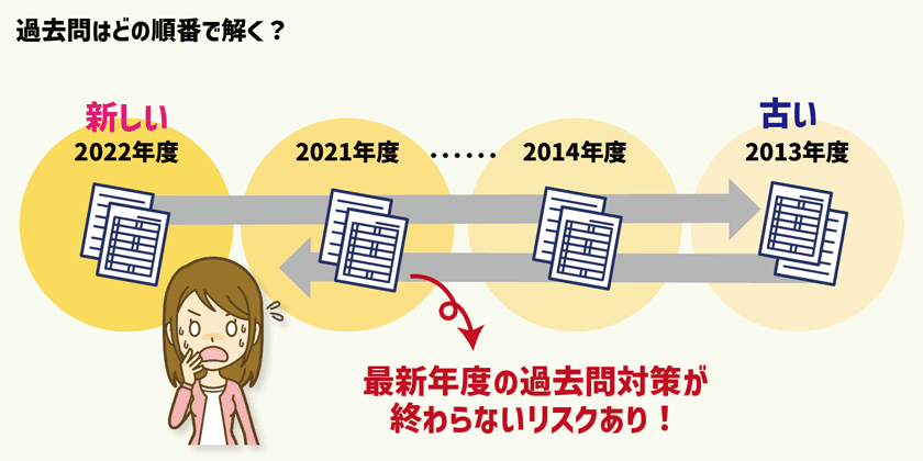 過去問をいざ始めようとすると、古い年度と新しい年度のどちらからやるのか迷います。