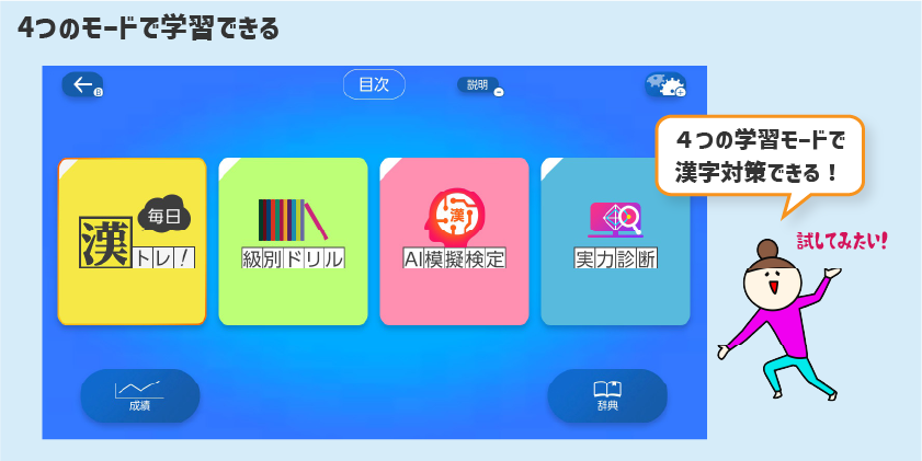 4つのモードで漢字力を身につけられる