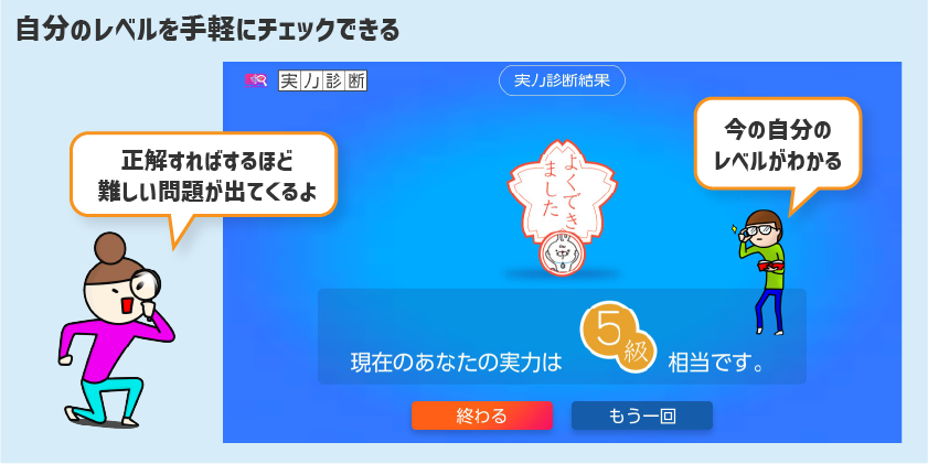 数問程度の問題を解くだけで自分がどの級のレベルにいるのかを知ることができます