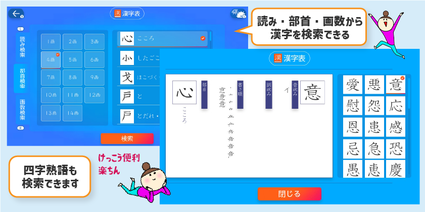 このソフトには漢検辞典の機能もあり「漢字表」と「四字熟語」が検索できます。