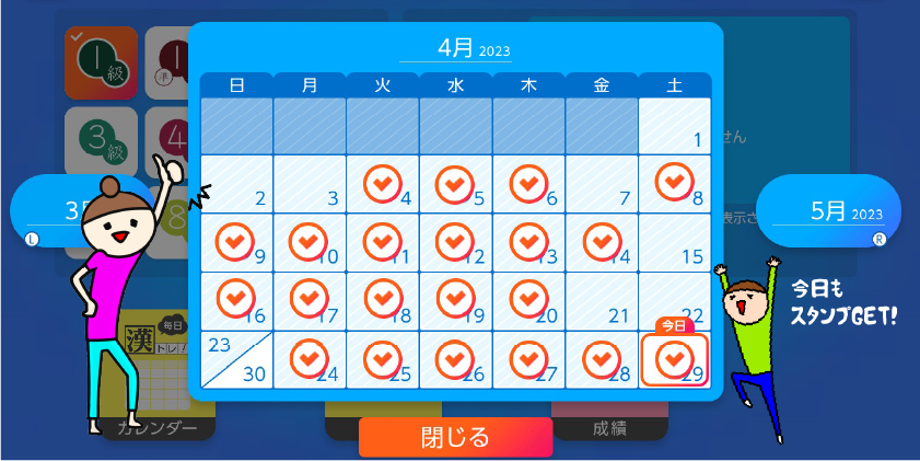 漢検スマート対策は、毎日学習するとカレンダーにスタンプを押してくれます。