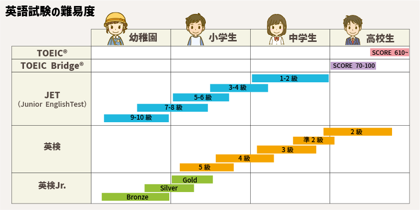 小学1年~3年の間は、比較的容易に受けられる「JET」や「英検Jr」が狙い目ですね。