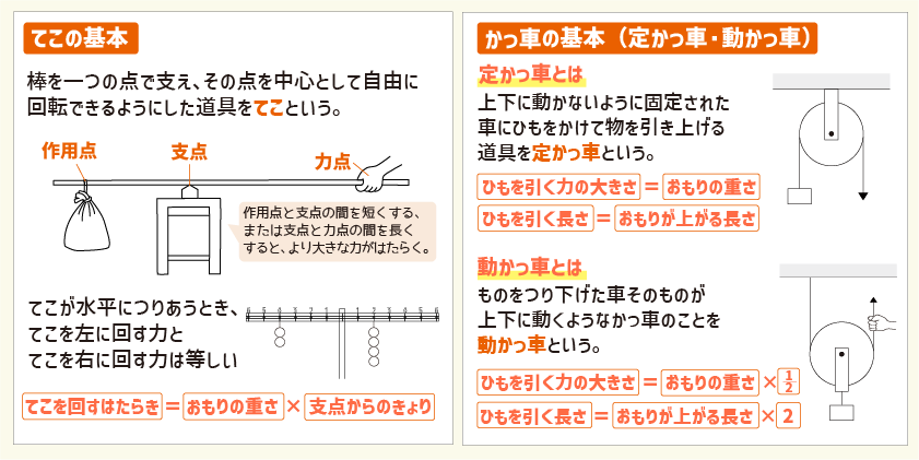 てこは、基本的なしくみ(支点・力点・作用点)と、てこのつり合いの法則が重要です。