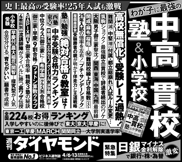 『週刊ダイヤモンド』2024年4月6日・13日号 合併特大号の第1特集は「わが子に最強の中高一貫校&塾&小学校」です。「二月の勝者」を目指す子どもたちの戦いが激しさを増しています。