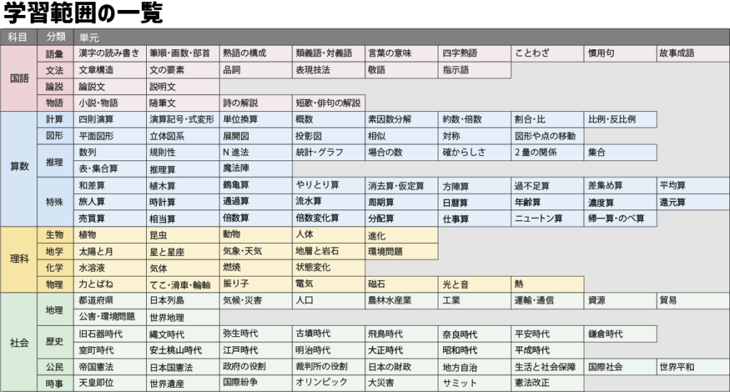 そこで、中学受験の範囲を探してみましたが、意外とほしい一覧表がないんです。