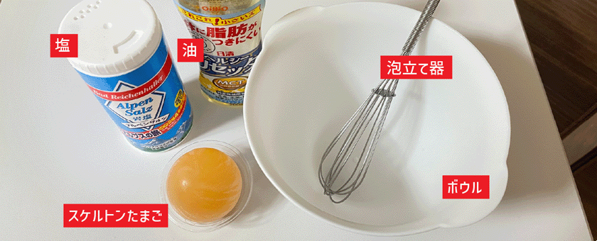 材料は、スケルトンたまご1個と油150cc、塩を用意してみました。