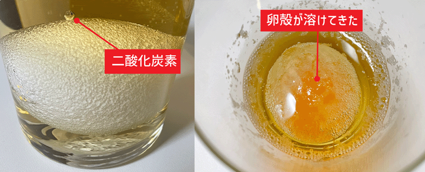 これは、お酢の成分の酸がたまごの殻の炭酸カルシウムを溶かしました