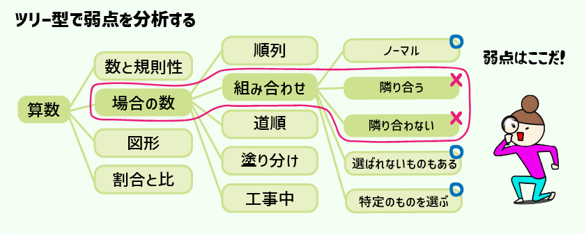 例えば、算数、場合の数、組合せ、道順、立体、工事アリというようにドリルダウンできます。