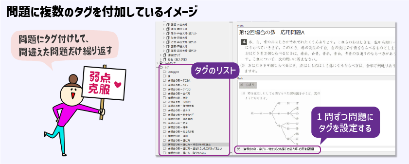 ツリー型の弱点リストを活用する際には、復習する問題そのものにタグが必要になります。